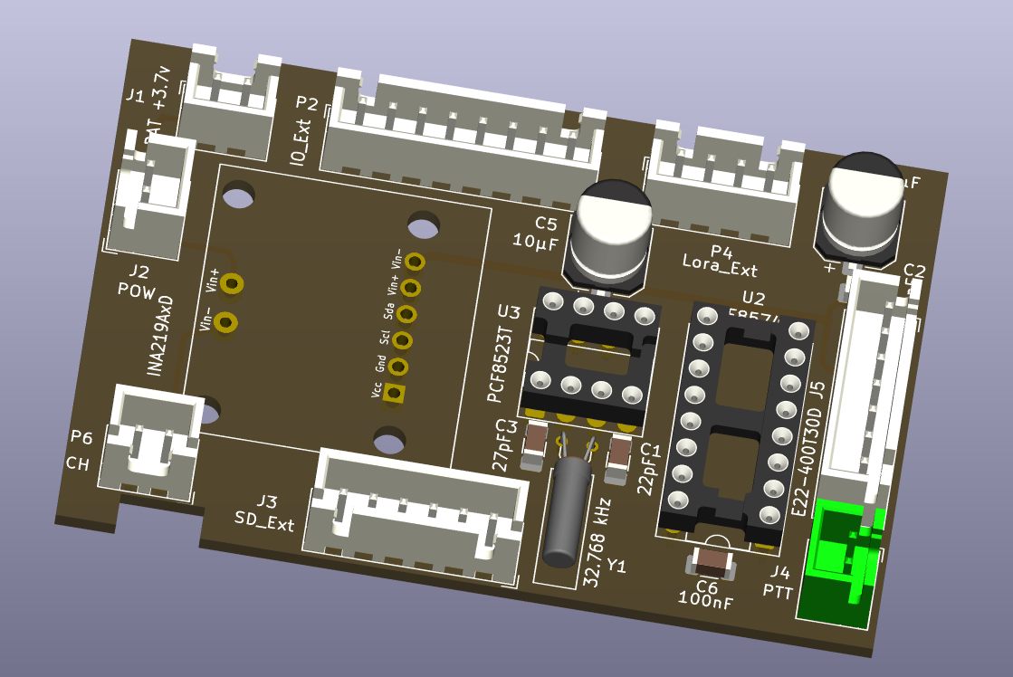 Le nouveau schéma Kicad de la carte de pilotage du transceiver LORA, carte SD, horloge temps réelle, PTT et mesure de la batterie. L'horloge est secourue par la batterie +3.7v qui sert aussi à alimenter l'ensemble.